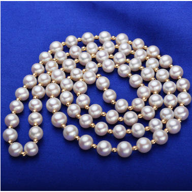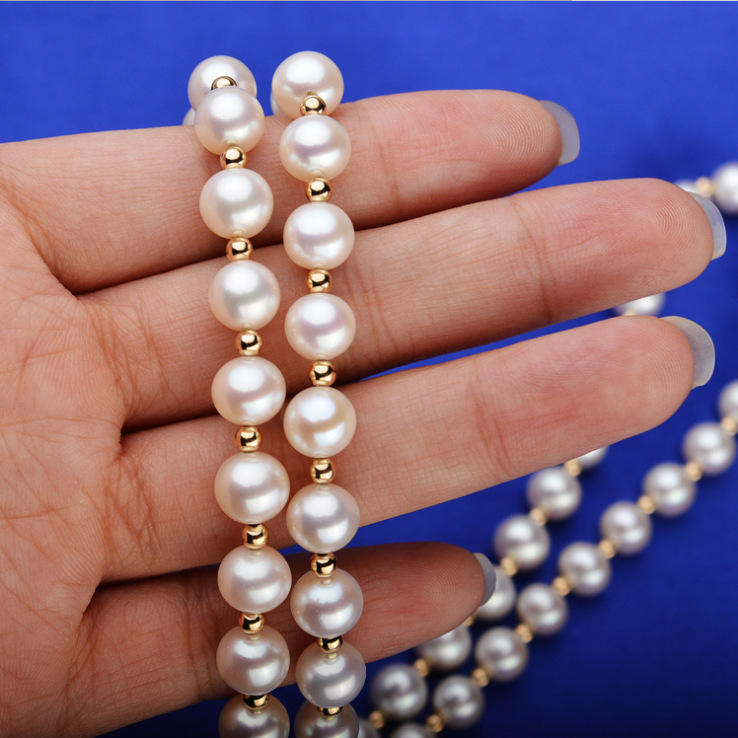 High-End 18K Gold Pearl Sweater Chain Near Circle 8-9mm Strong Light Almost Flawless Necklace