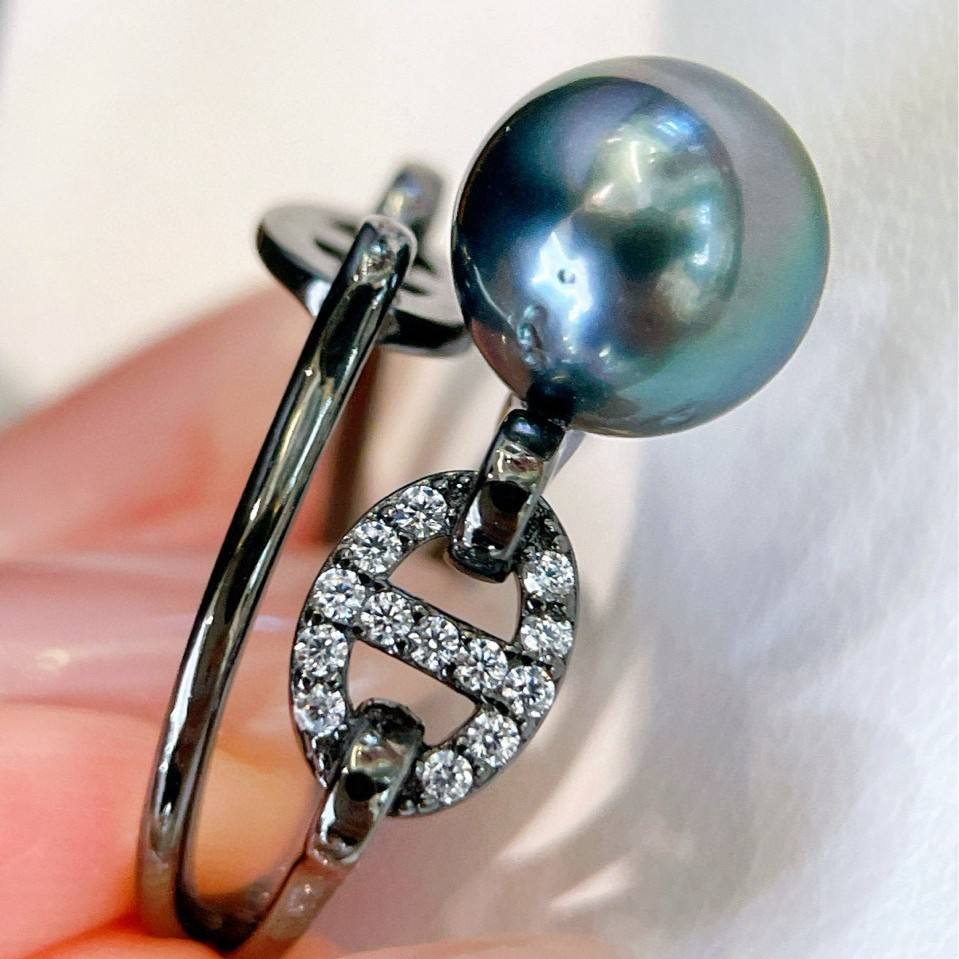 High-End Black Silver Pig Nose Peacock Green Pearl Ring New Boutique 9-10mm Round Flawless Rhodium & Silver Plated Inlay Setting