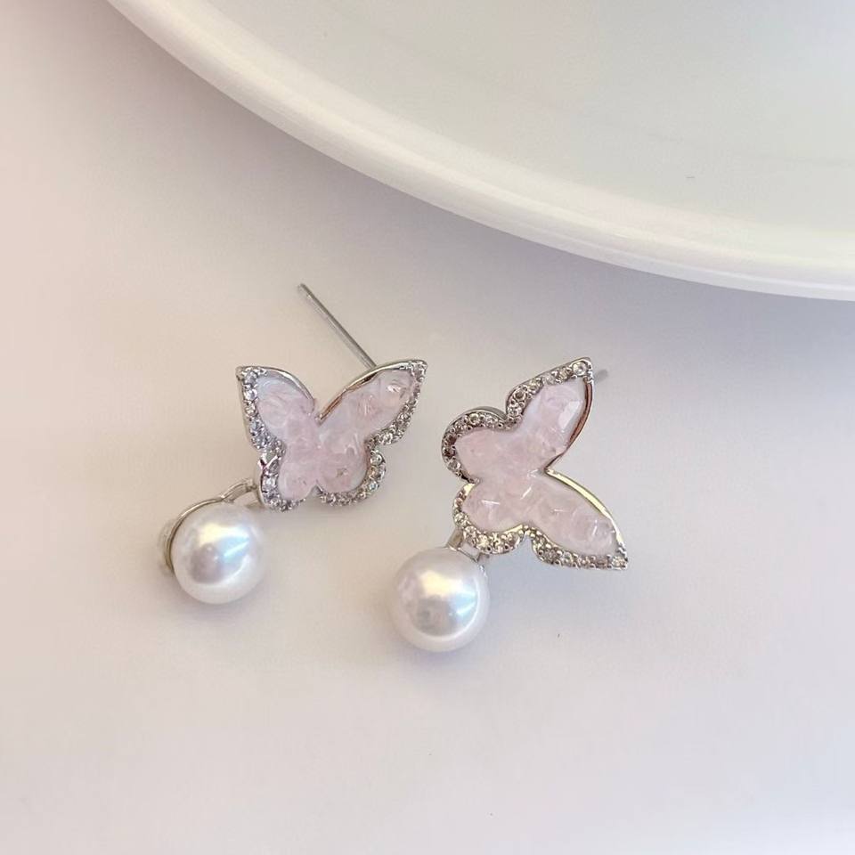 High-End Blue Pink Butterfly Earrings with Natural Pearl Versatile Colorful Dangle Style for Retail and Wholesale