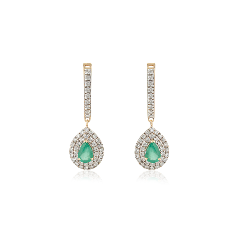 High End Custom Design 14K Pure Yellow Gold Emerald & Diamond Letch Back Double Cluster Hoop Drop Earrings Wedding Jewelry