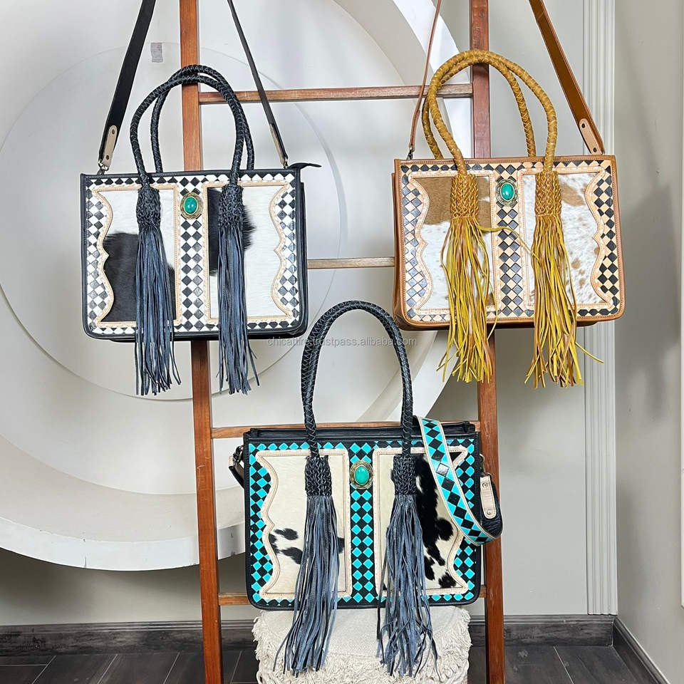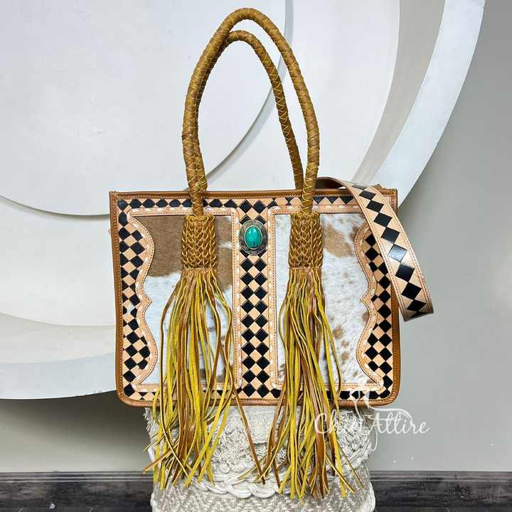 Hand Tooled Turquoise Stone Checkered Leather Tote Bags