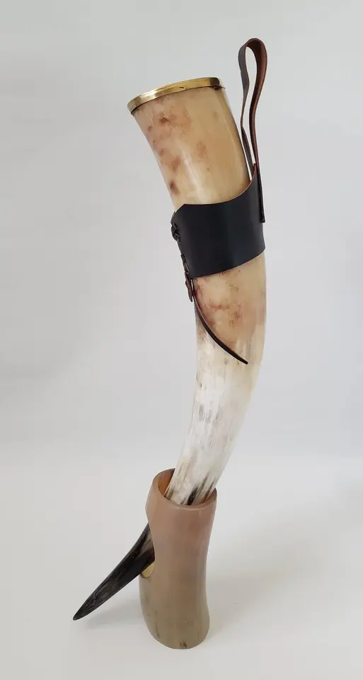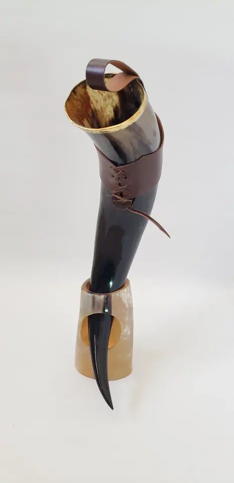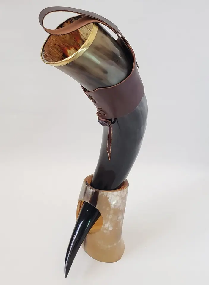 High End Drinking Horn with Thick Leather Holder for Secure Grip and Durability for Collectors and Unique Home Bar Accessories
