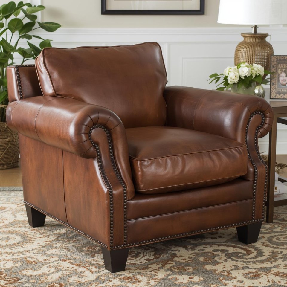 High End Genuine Leather Single Armchair Traditional Rolled Arm Accent Chair Nailhead Trim for Living Room Hotel Seating