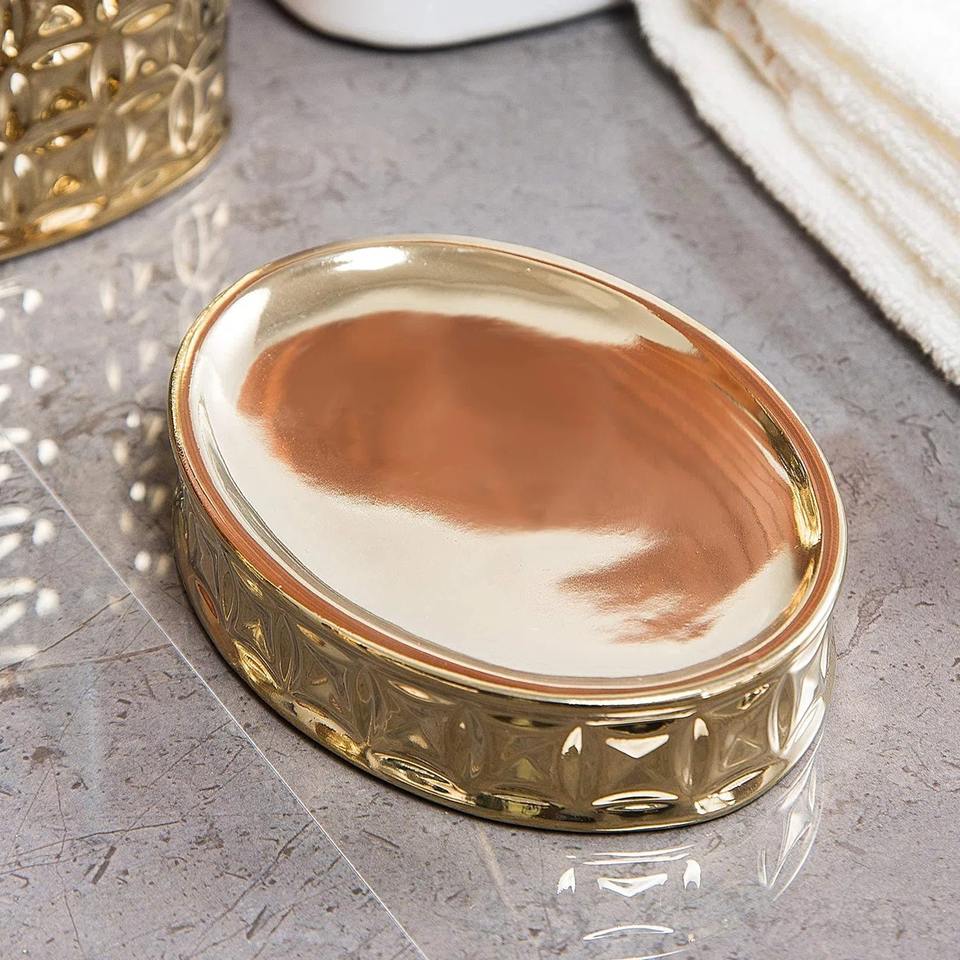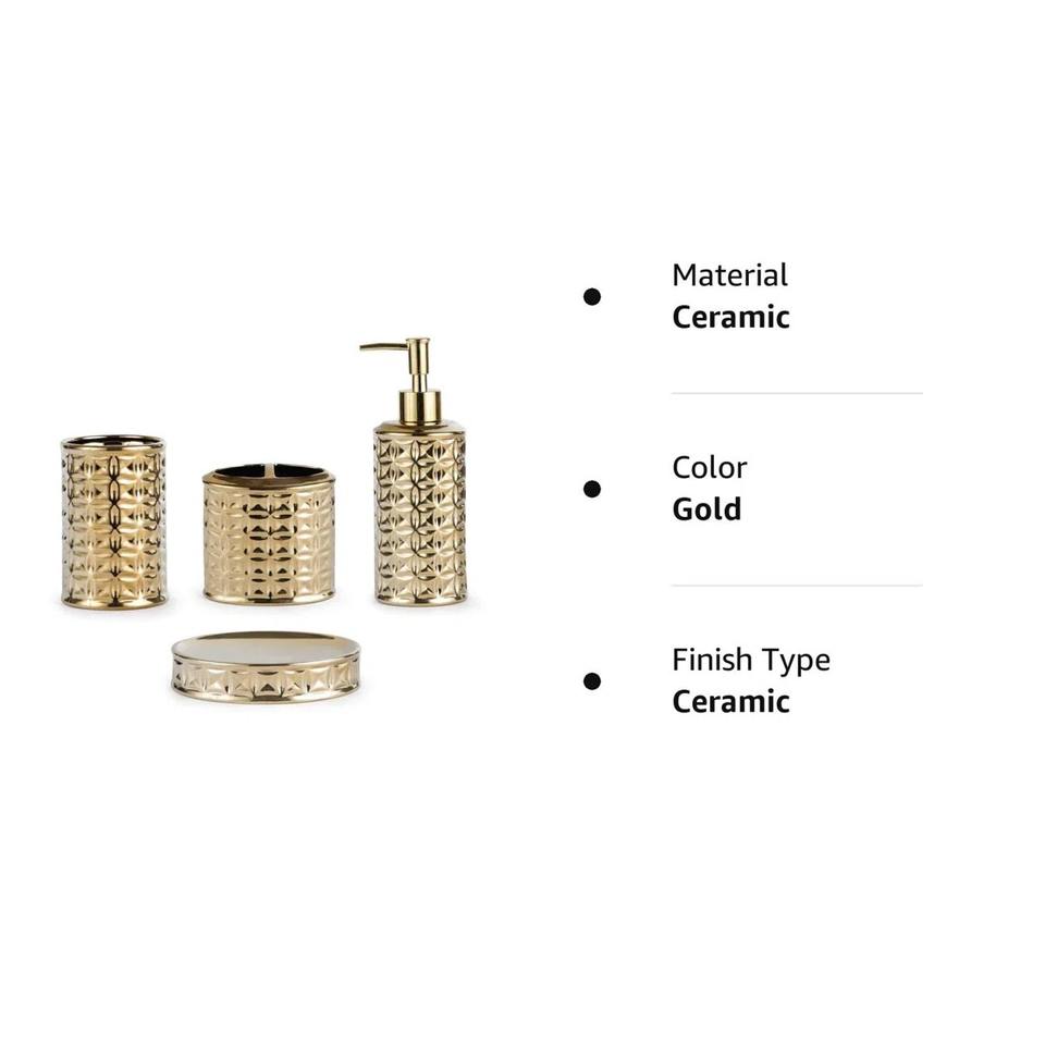 High End Gold Bathroom Accessories Set With Decorative Pattern For Luxury Bathroom Decor Spa And Wellness Center Use From India