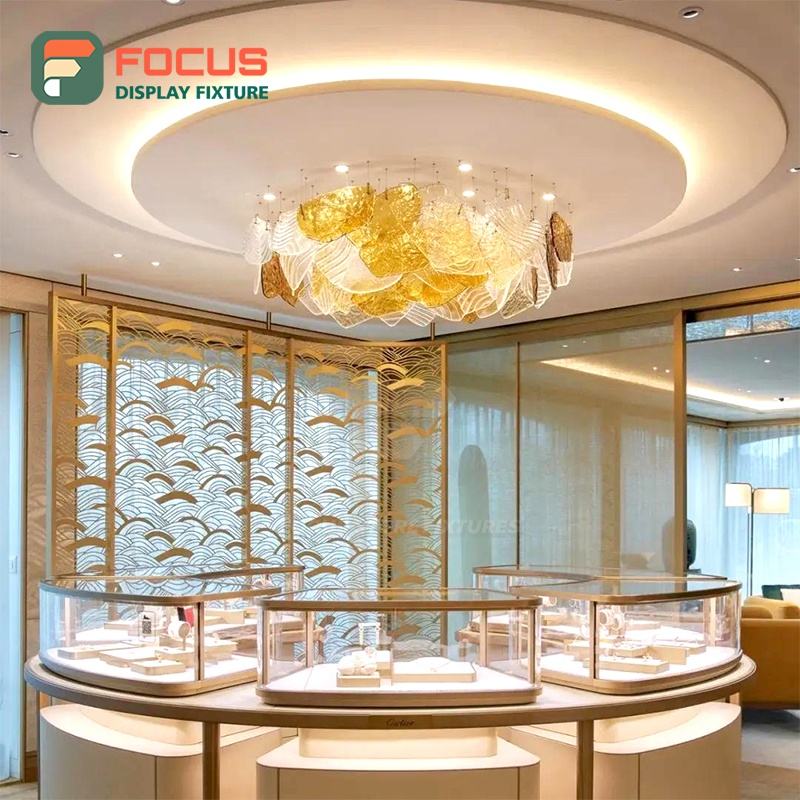 High End LED Light Wooden Jewelry Counter Glass Display Cabinet Luxury Modern Jewelry Shop Interior Design