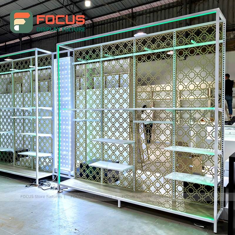 High End Retail Display Rack White Metal Frame Decorative Back Panel Adjustable Glass Shelves