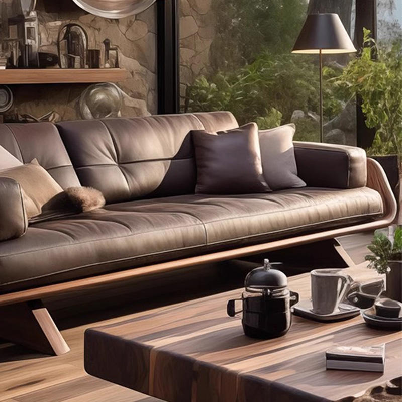High-End Solid Wood Leather Sectional Sofa New Middle-Aged Walnut Design for Hotels Small Apartments Three-Seater Living Room
