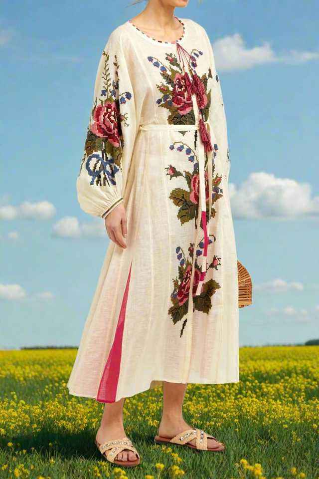 High Fashion Embroidered Ukrainian Wedding Dress Long Sleeve Round-Neck Floor Length Boho Gypsy Elegant Style Midi Length Woven