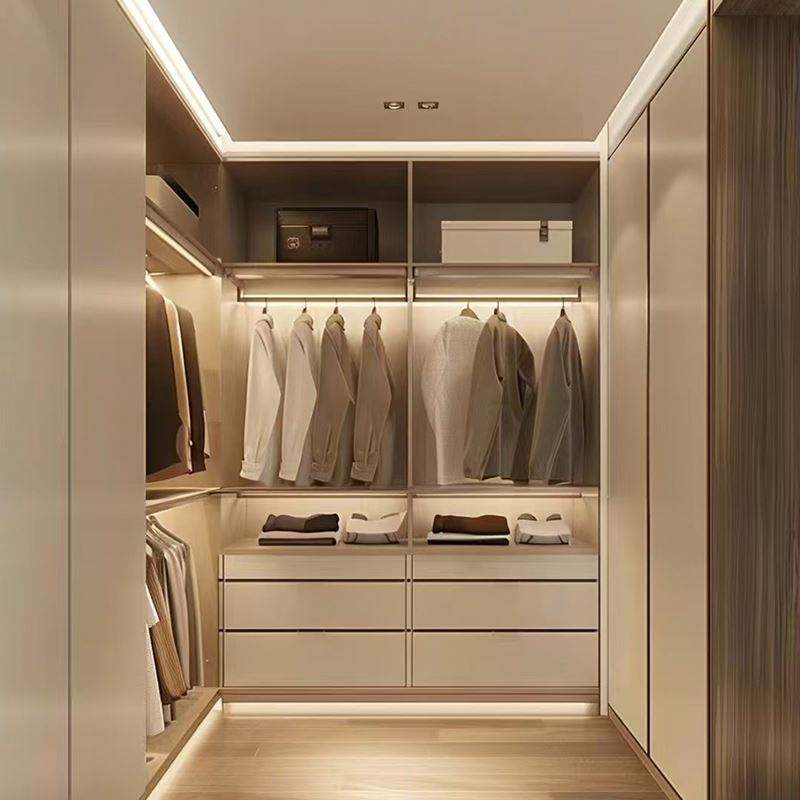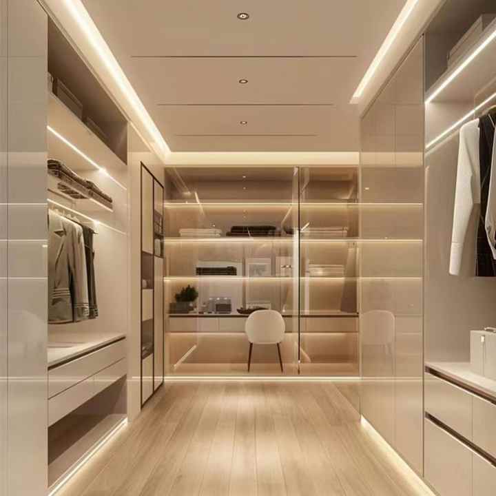 High Gloss White Wooden Bedroom Walk in Wardrobe Closet with Strip Light
