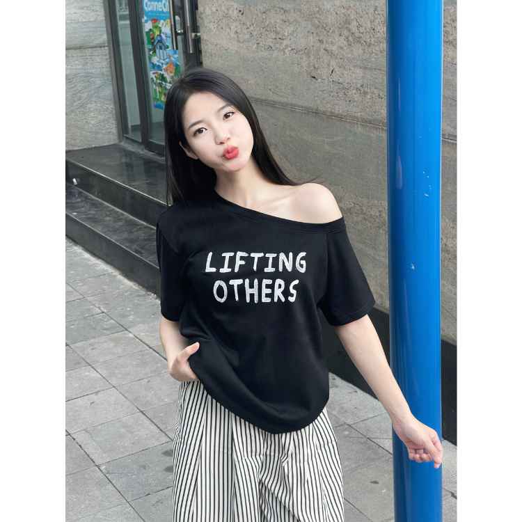 High Grade Women's One-Shoulder T-Shirt MISOUL, Short Sleeve, Trendy Letter Print, Soft Paper Cotton Fabric Black Color