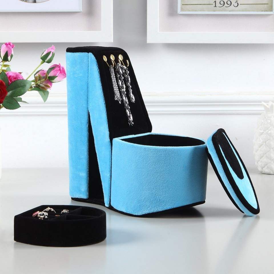 High Heel Shoe Design 9\" Tall Turquoise Velvet Jewelry Box with Hooks