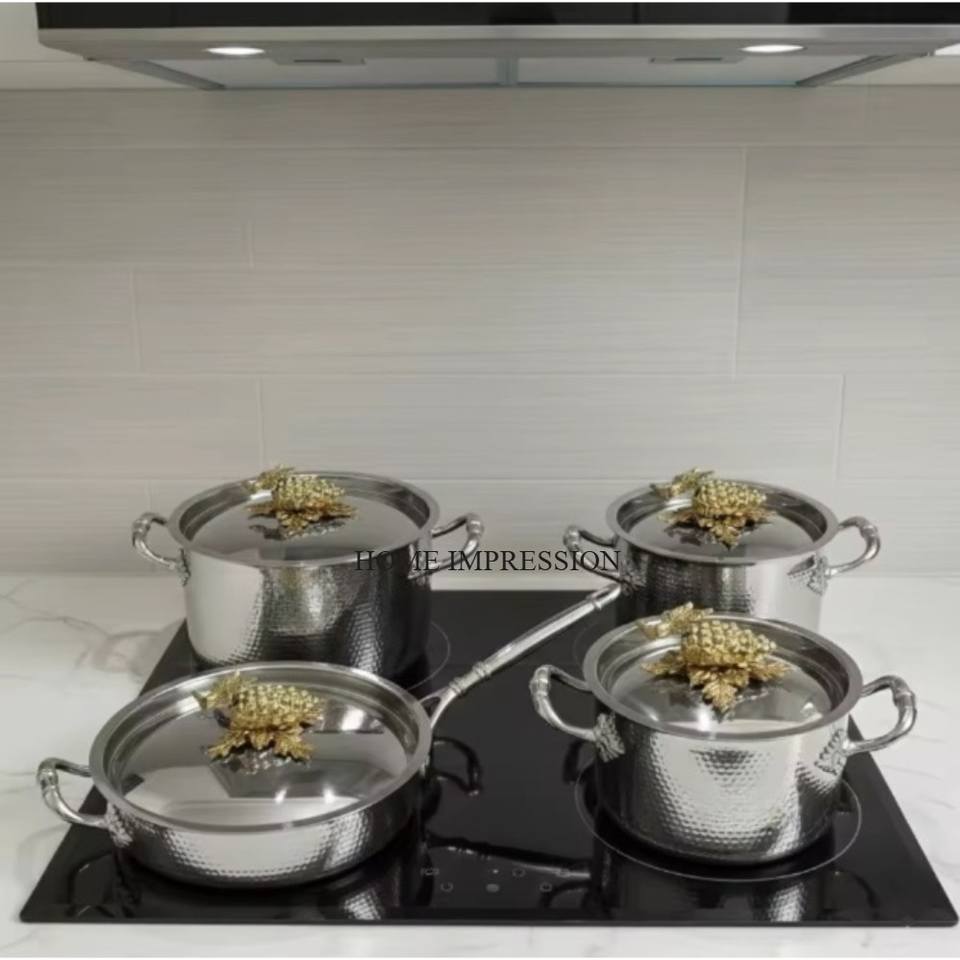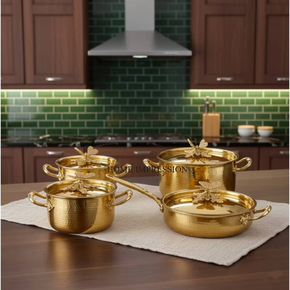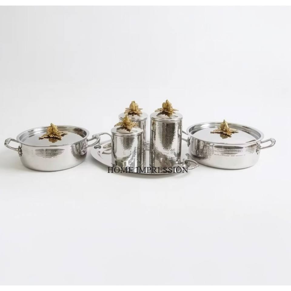 High In Demand Top Quality Stainless Steel Silver Polished Hammered Texture Golden Butterflies Casseroles And Canisters Set