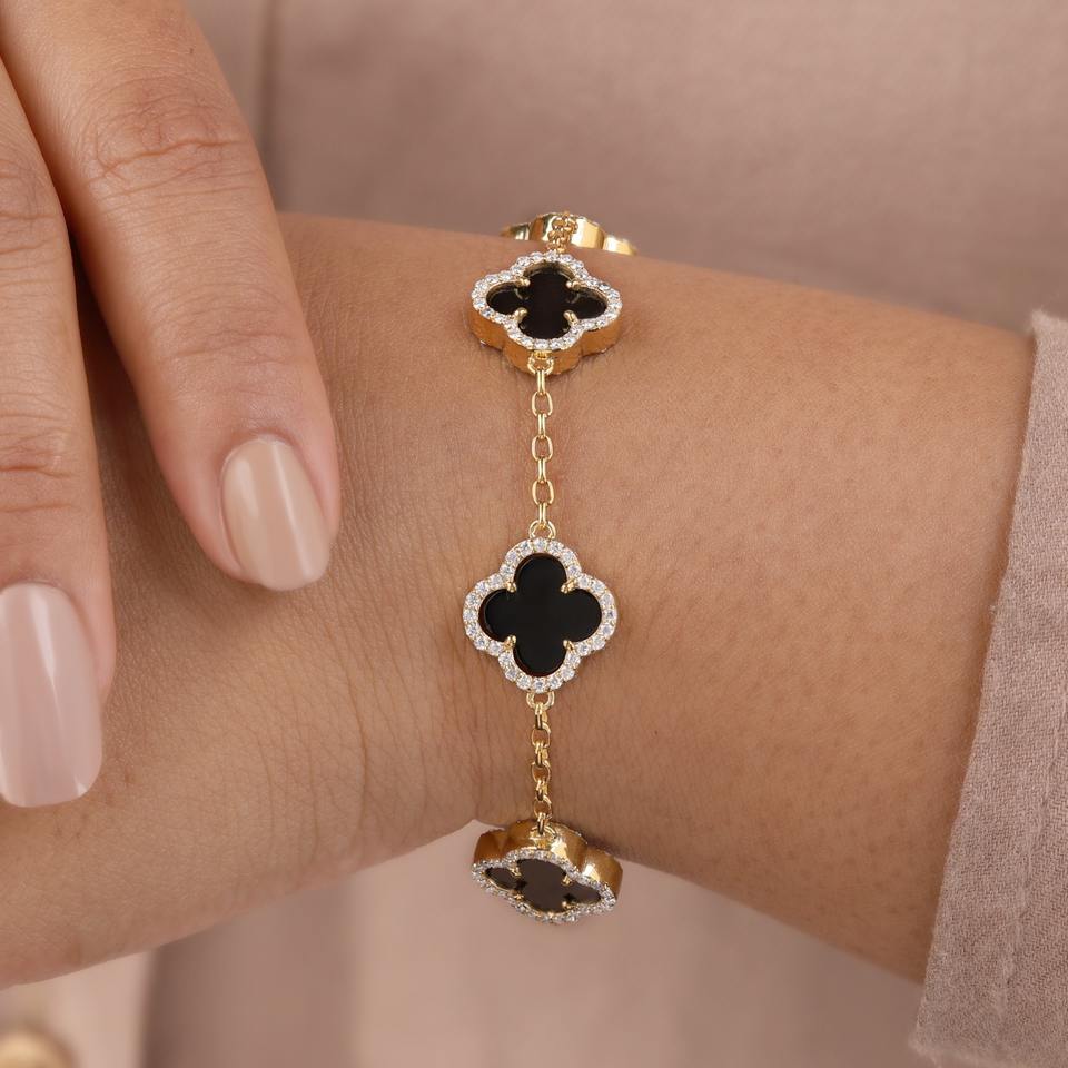 High On Demand Leaf Clover Gold Link Bracelet with Black Onyx and CZ Stones Luxury Clover Charm Chain Bracelet gift for her