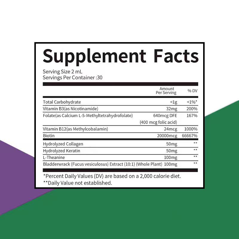 Main Ingredient:Biotin, Vitamin B3, Folate, Vitamin B12, Hydrolyzed Collagen Peptides, Hydrolyzed Keratin Peptide, L-Theanine, Bladderwrack Extract