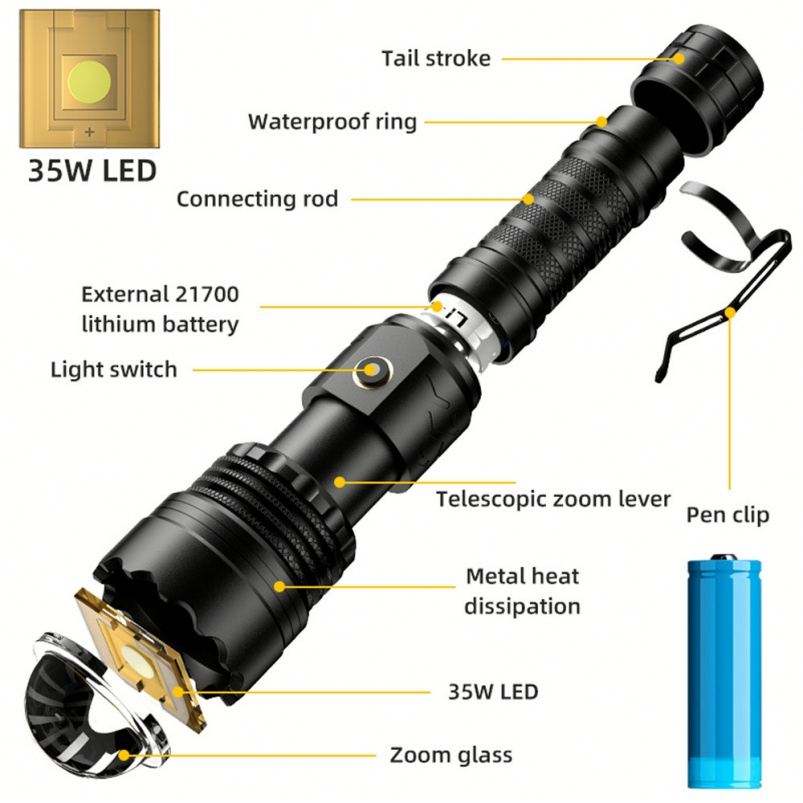 WOSEN High Power Long Range Flashlight Aluminum Alloy Zoom 21700 Rechargeable Battery Type-c Charging Camping Torch