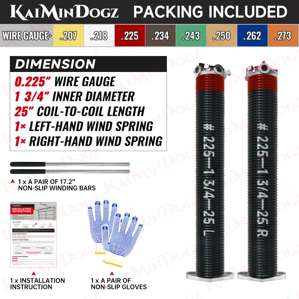 High Precision Electrophoresis 0.225X1.75"X25" Garage Door Torsion Springs Set with Non-Slip Winding Bars & Gloves