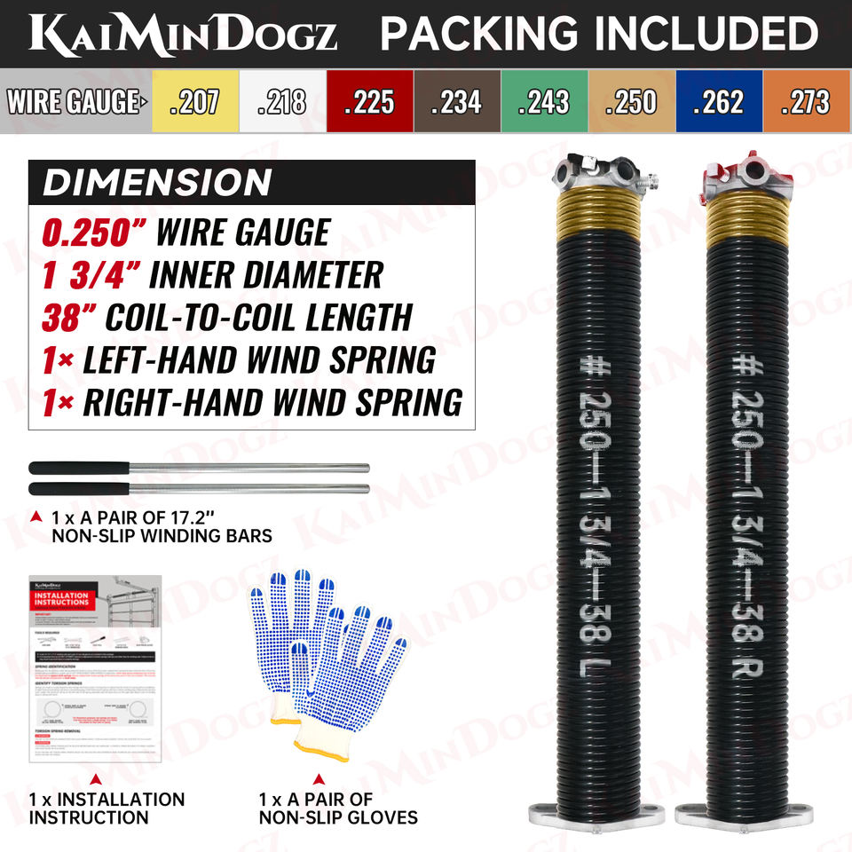 High Precision Electrophoresis 0.250X1.75"X38" Garage Door Torsion Springs Set with Non-Slip Winding Bars & Gloves