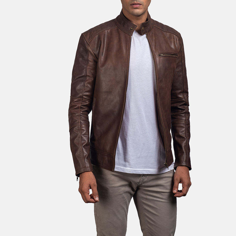 High Quality 100% Genuine Brown Leather Zip-up Jacket for Men Stand Collar Winter Fashion Warm Letterman Style jacket for men