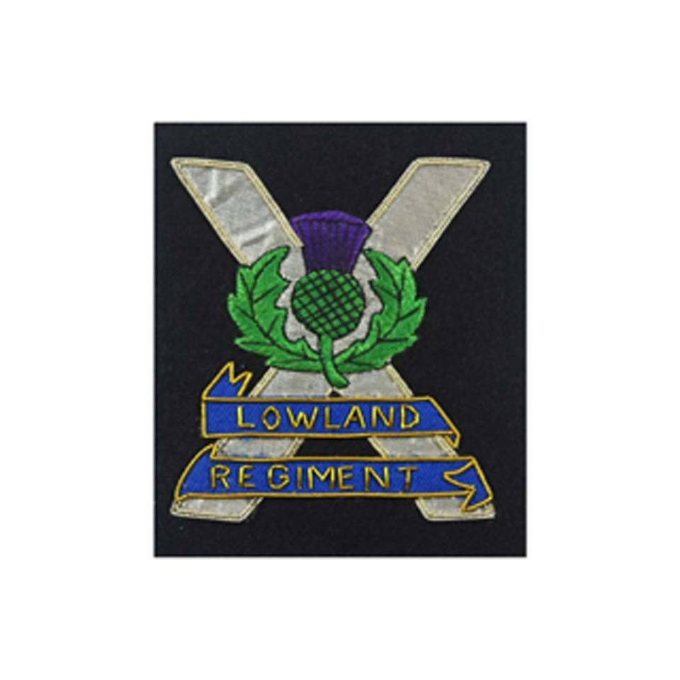 High Quality 10cm X 9cm Manufacturer Gold Wire Bullion Blazer Badge Embroidered Lowland Regiment Sew-On with Lace Decoration