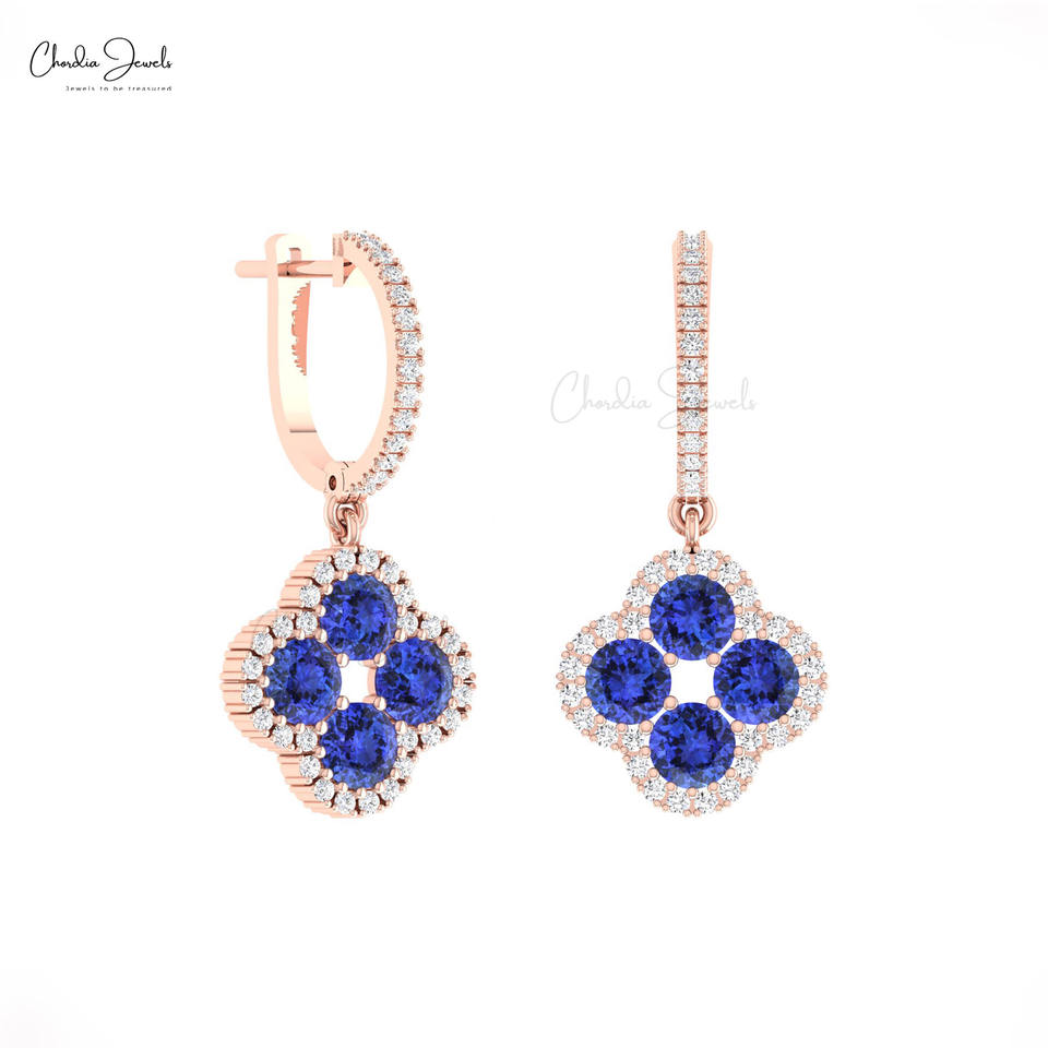 High Quality 14k Solid Gold Tanzanite Statement Earrings 0.58 CTW Ntaural White Diamond Clover Shape Dangle Earrings With No MOQ