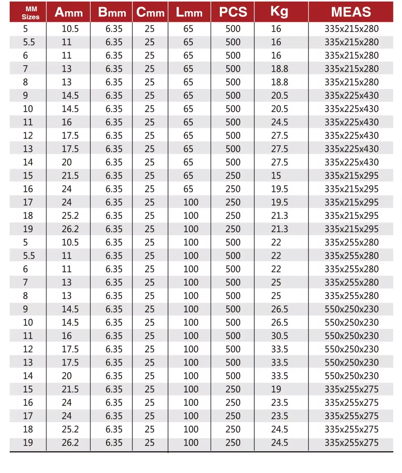 3/4 in, 1/2 in, 3/8 in, 2 1/2 in, 1/4 in