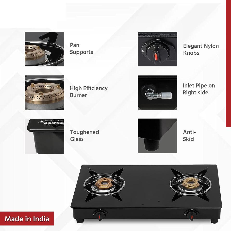 High Quality 2-Burner Glass Top Gas Stove Compact Kitchen Cooktop with Manual Ignition Brass Burner Direct B2B Wholesale India