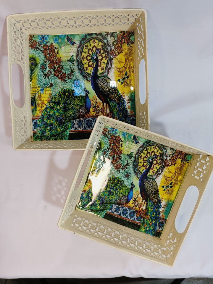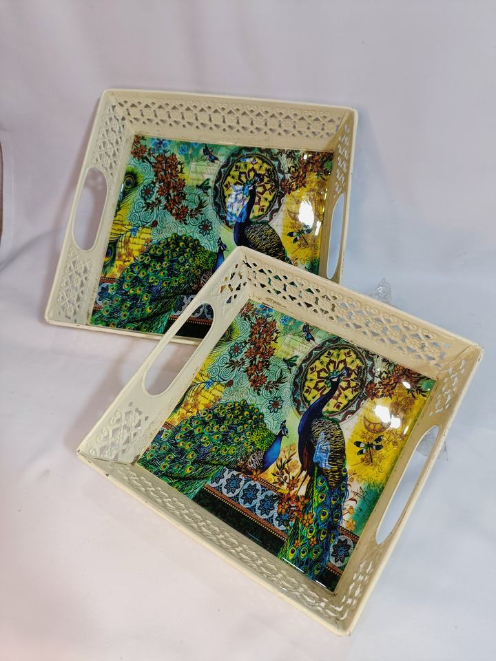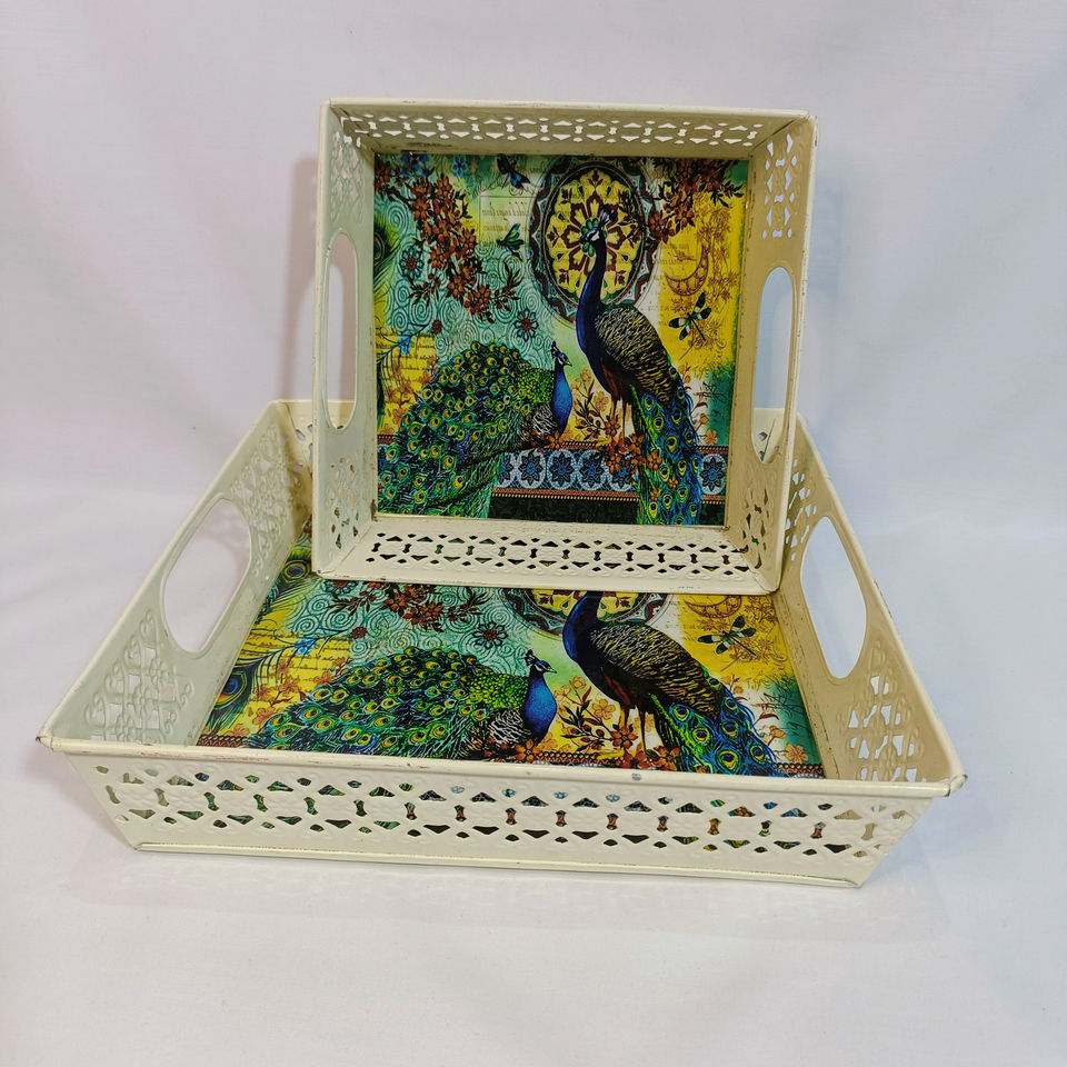 High Quality 2-Size Square White Enamel Decor Metal Serving Tray Excellent Peacock Flower Iron Etching Sticker Serving Tray