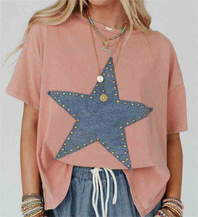 High Quality 2025 Summer Short Sleeve Apricot Pink Mineral Wash Studded Star Patch Star High Low Tee T-shirt Top