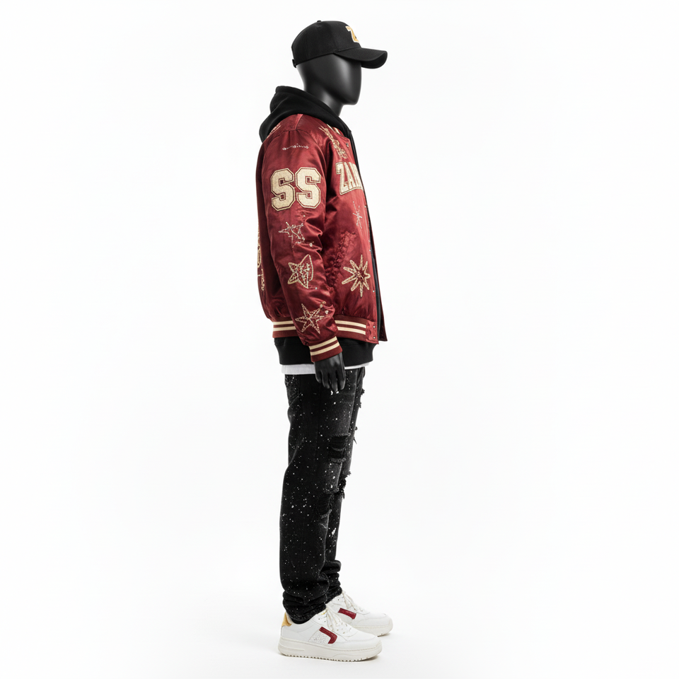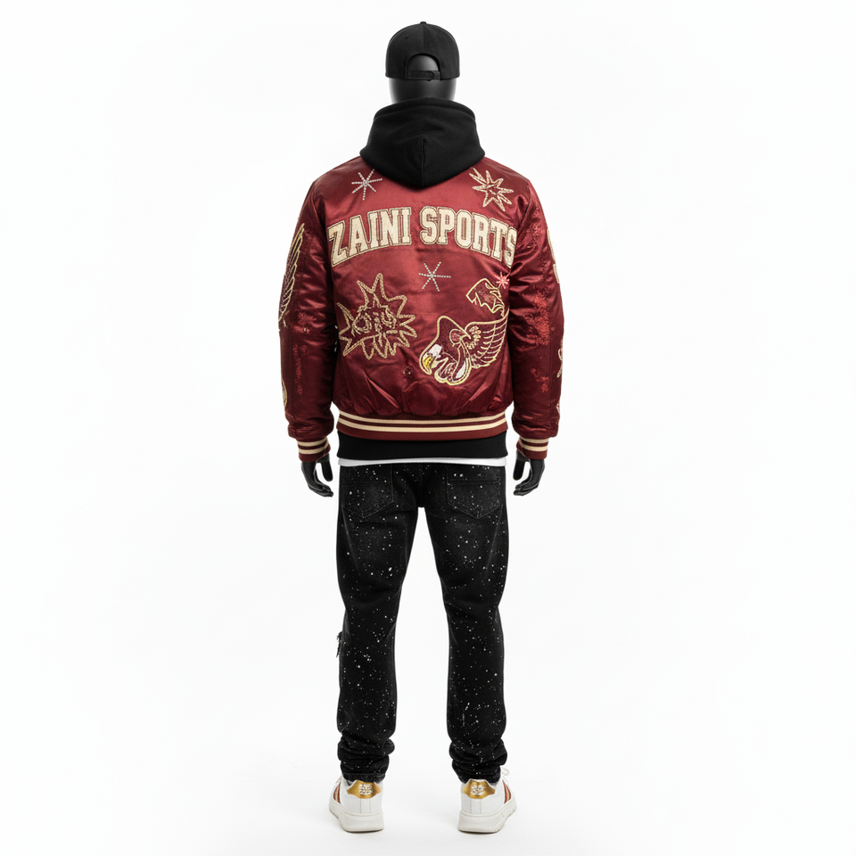 High Quality 320GSM Satin Varsity Jacket Maroon Gold Embroidered Custom Logo Stylish Unisex Streetwear Satin Jacket For Men
