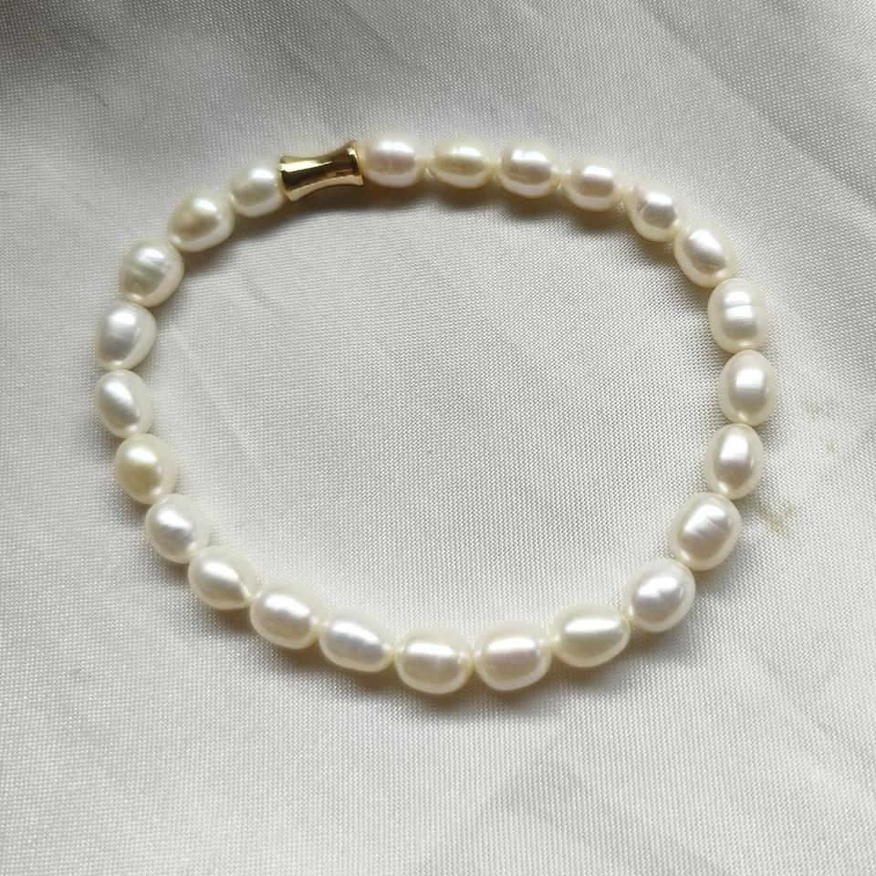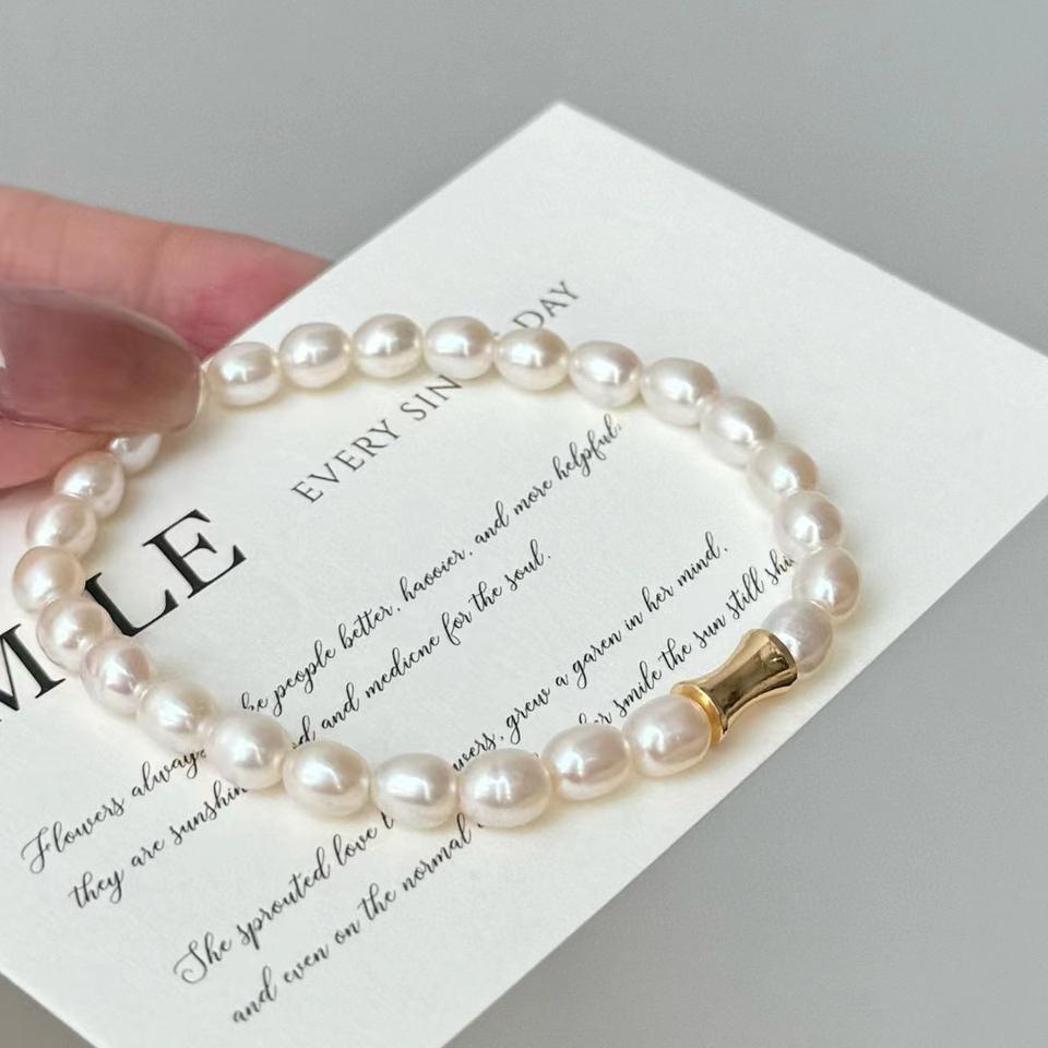 High Quality 5-6MM Freshwater Rice-Shaped Seedless Pearl Bracelet with Diamond Gold and Elastic Leather Waist Glossy Clean