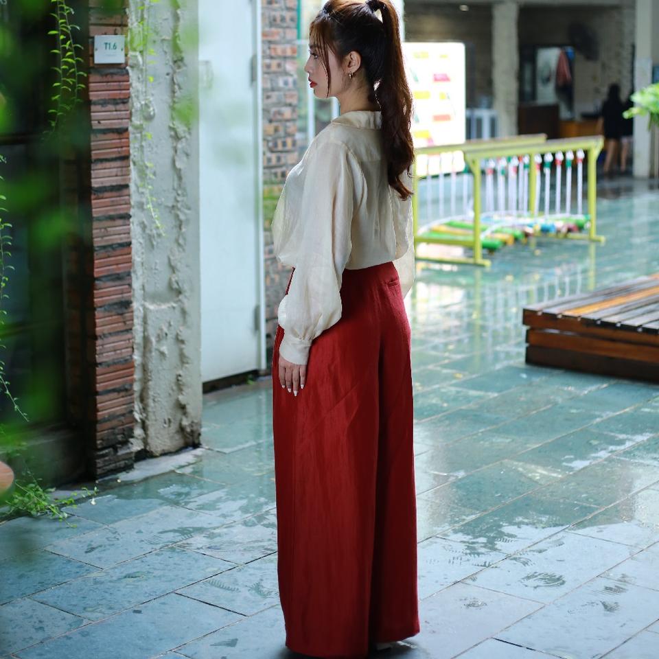High Quality 50% Silk & 50% Linen Casual Breathable Mid Waist Flat Front Loose Design Wide Leg Pants