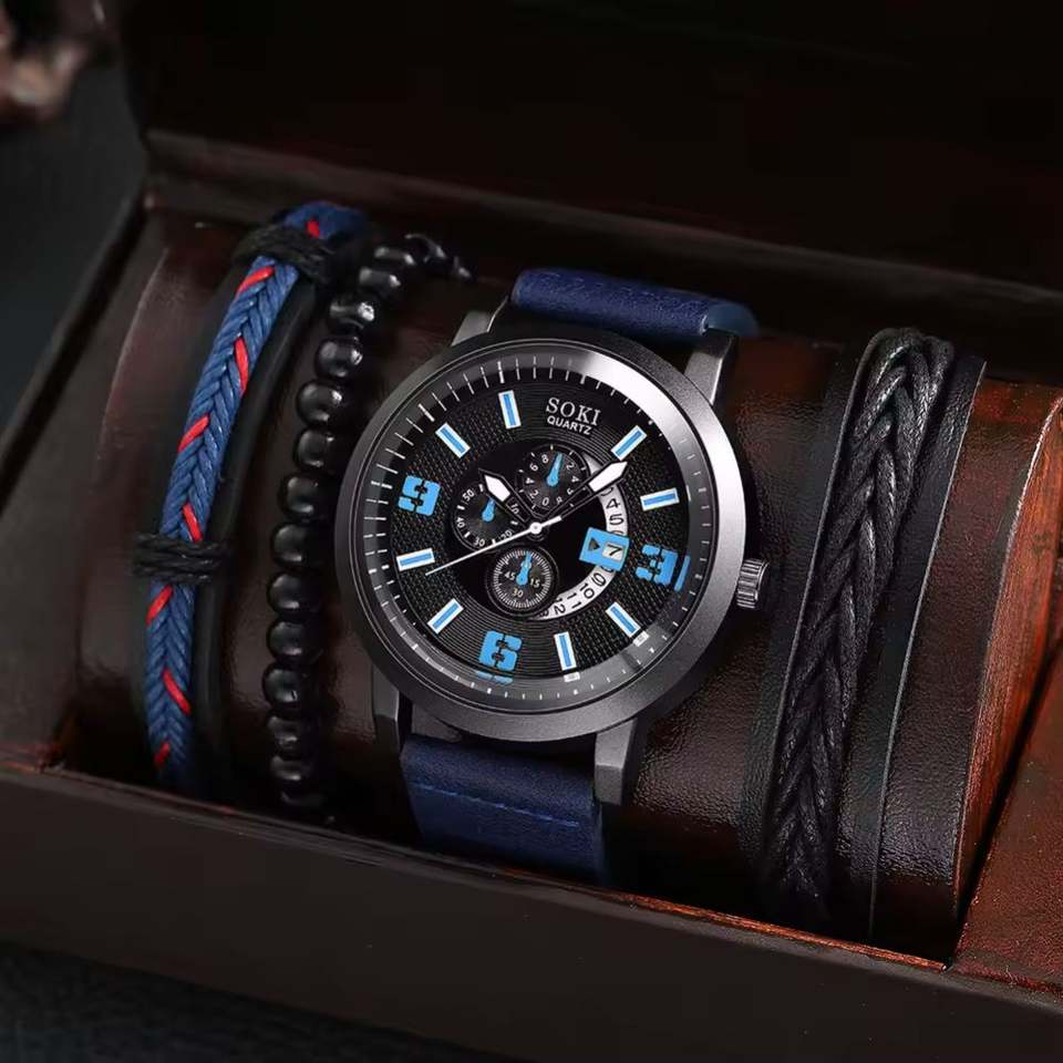 High Quality 6272 4 Pcs/Set Casual Leather Strap Number Date Quartz Wristwatch Man Simple Sport Style Male Clock
