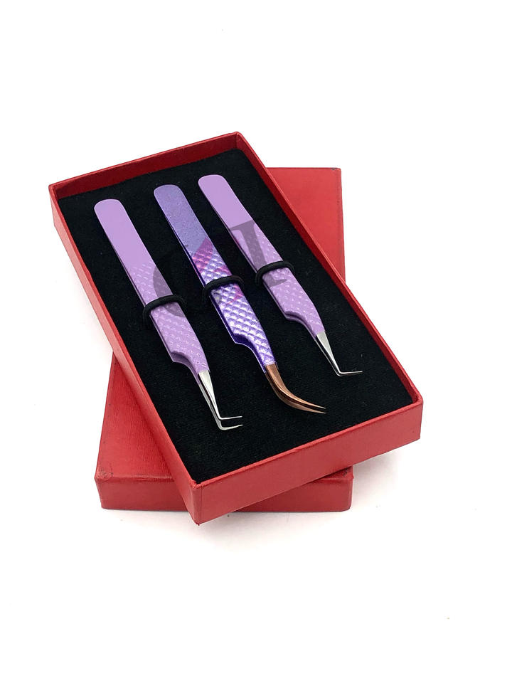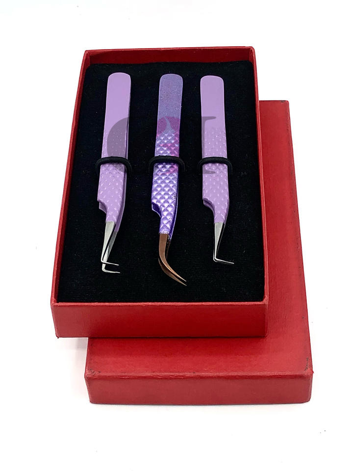 High Quality 90 Degree Light Purple Powder Coating Rose Gold Tip Curved Stainless Steel Eyelash Extension Tweezers Beauty Tool