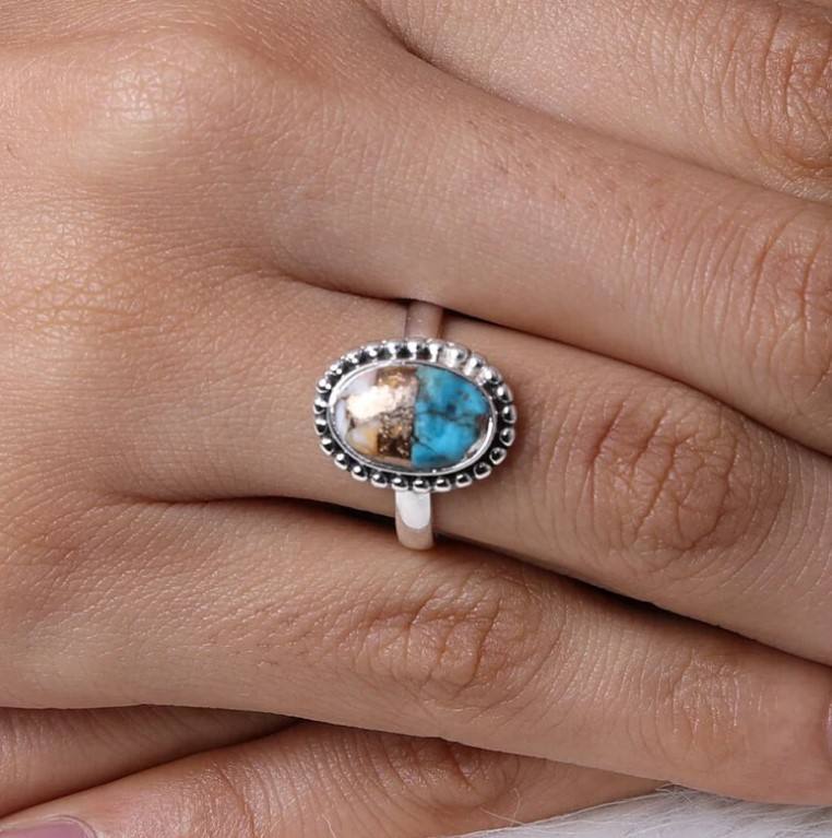 High Quality 925 Sterling Silver Ring Simple Solid Design Oval Setting Beaded Genuine Mohave Oyster Copper Turquoise Fine Rings