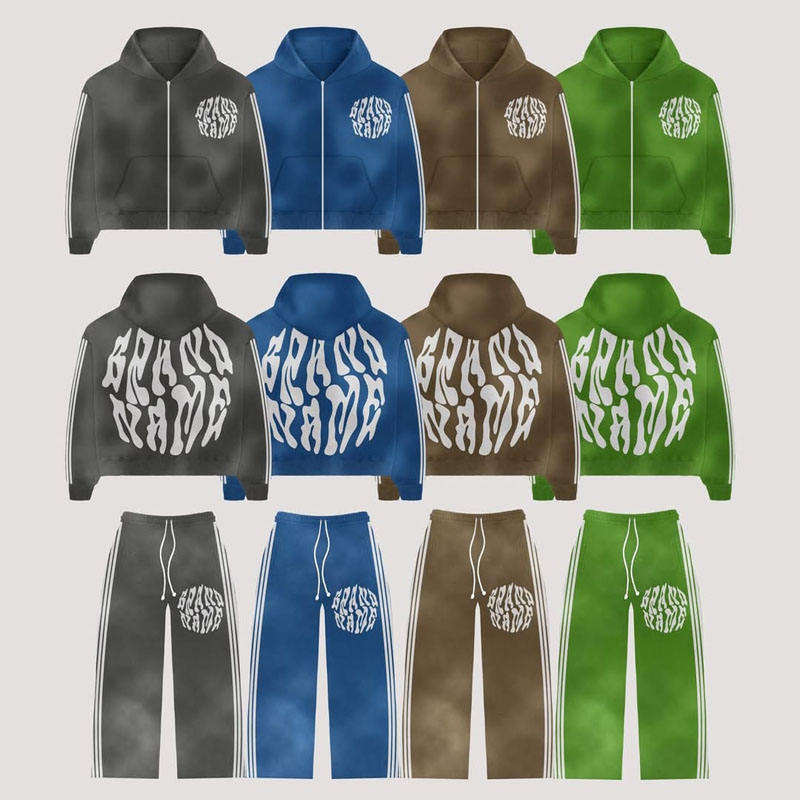 High Quality Acid Wash Zip-Up Sweat Suits Sun Faded Hoodies and Sweatpants Printed Tracksuits for Winter