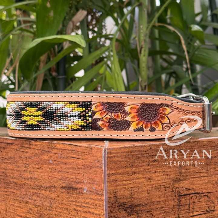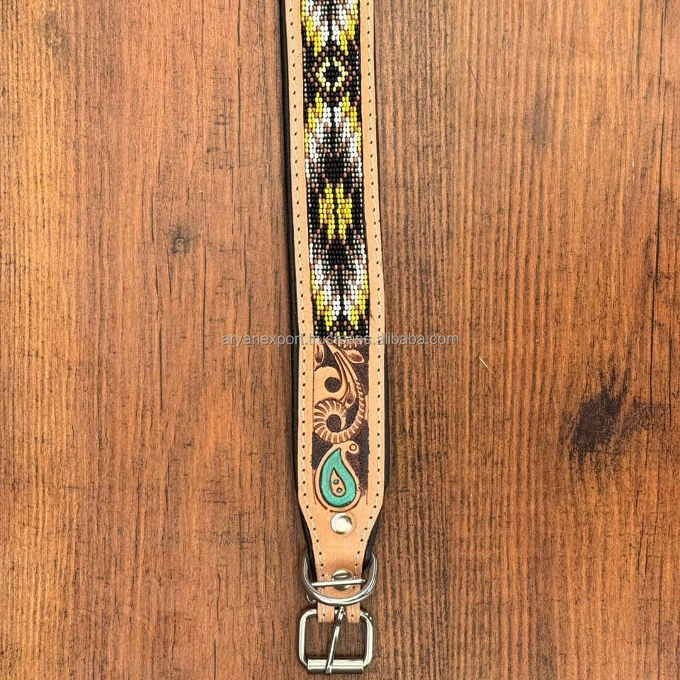 High Quality Adjustable Hand Tooled Leather Beaded Pet Collars Soft Padded Genuine Cowhide Leather Durable Heavy Duty Dog Collar