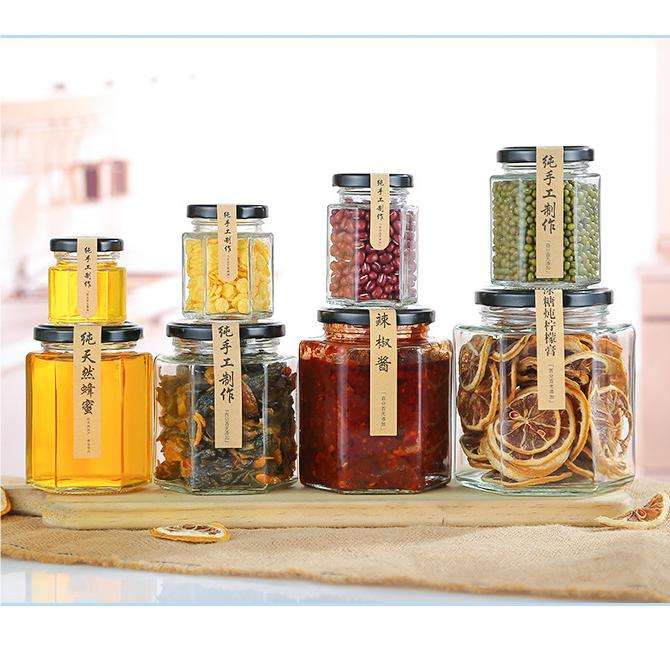 High Quality Airtight Hexagon Glass Honey Jar Food Storage and Jam Packaging Glass Bottle for Honey With Aluminum Lid