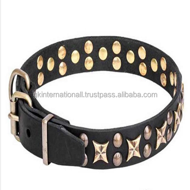 High Quality Authentic Leather Dog Collar with Old Plated Two Row Studs and Large Gold Stars Roller Pin Buckle and D Ring