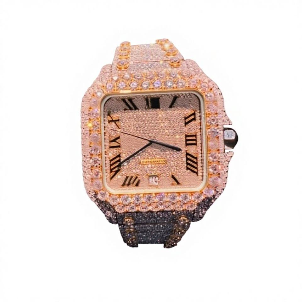 High Quality Automatic Square Stainless Steel Glass Dial Analog Diamond Moissanite Iced Watch Bracelet Clasp 10 Bar Water