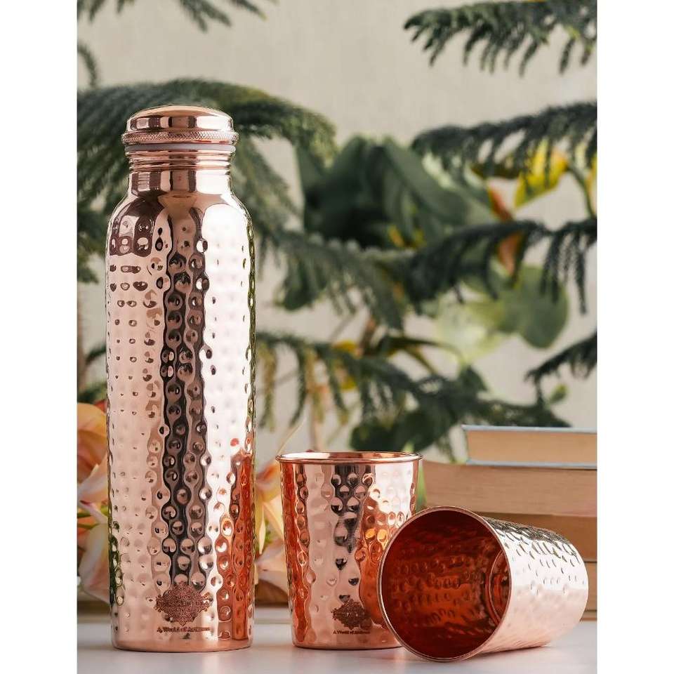 High Quality Ayurvedic Copper Bottle and Glass Set with Natural Detox Water Storage and Food Safe for Office and Travelling Use