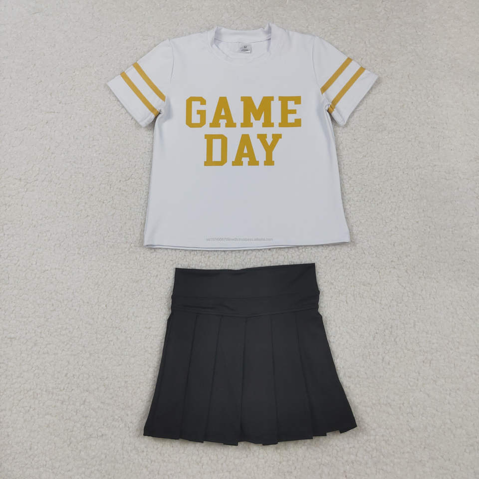 High Quality Baby Girls Active Summer Clothing Game Print White Short Sleeve Top With Black Skort Two Piece Yoga Outfit