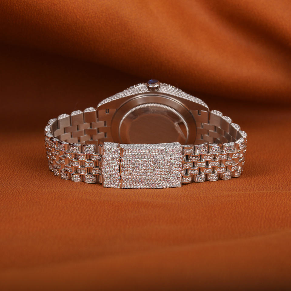 High Quality Bling Monochrome Wrist Watch with Fully Iced out Blue Dial VVS Moissanite Date Display Trendsetting Analog Style