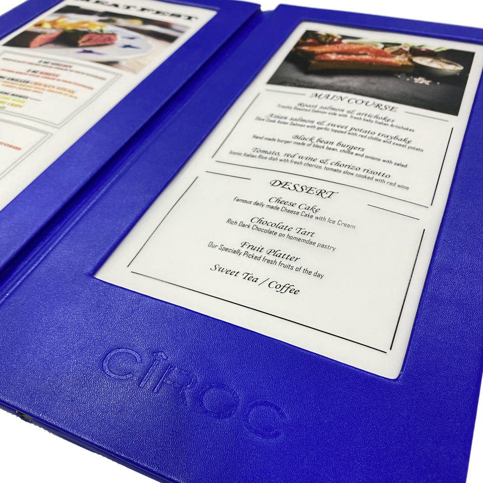 High Quality Blue Faux Leather Illuminated Menu Holder 2 Page Cover Illuminated Menu Board Led Restaurant Menu