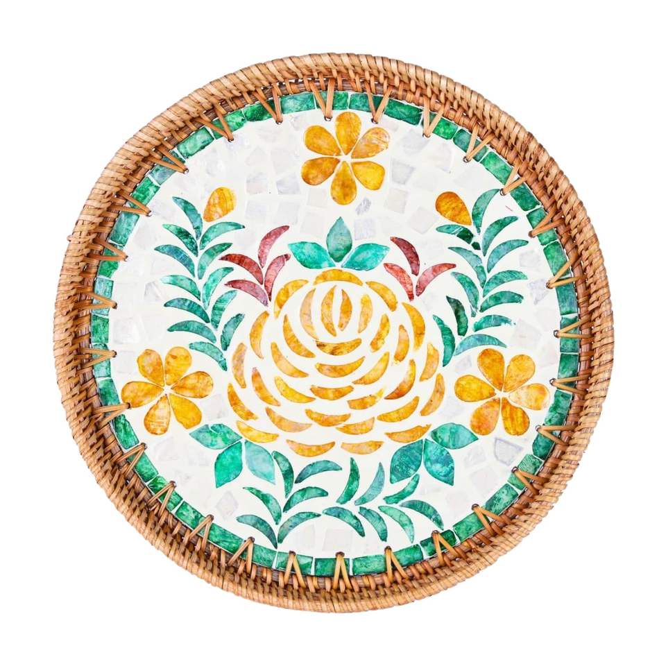 High Quality Boho round Woven Rattan Serving Tray Mother of Pearl Accent for Coffee Table Home Decor