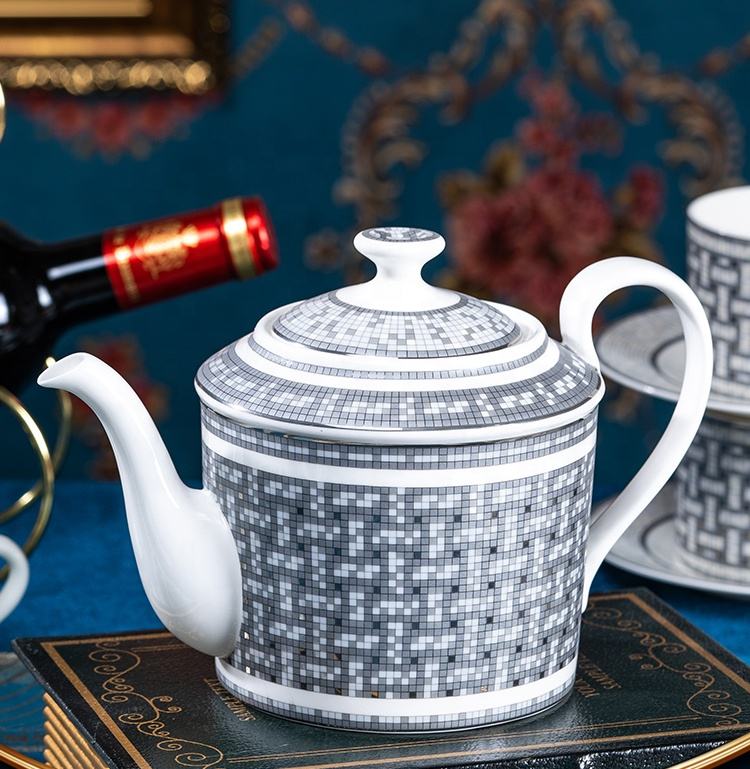 High Quality Bone China Grey 15pcs Mosaic Coffee Set Gold Edge Luxury Coffee Pot Sets