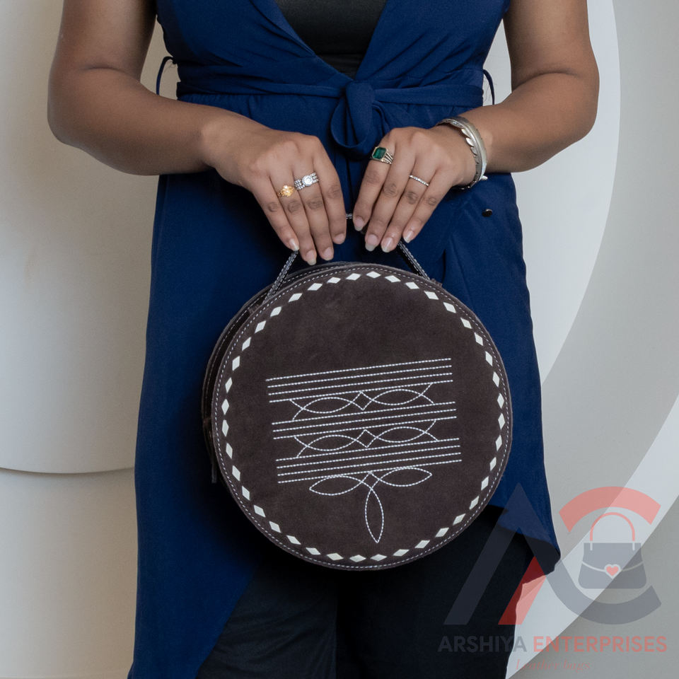 High Quality Brown Suede Genuine Cowhide Leather Canteen Purse Premium Zipper Closure Crossbody Bag with Embroidery Decoration