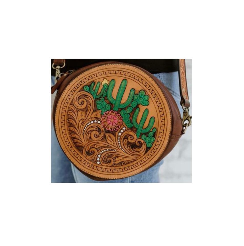 High Quality Cactus & Floral Tooled Round Brown Leather Women Purse & Handbag With Shoulder Strap for Daily Usage Hot Selling