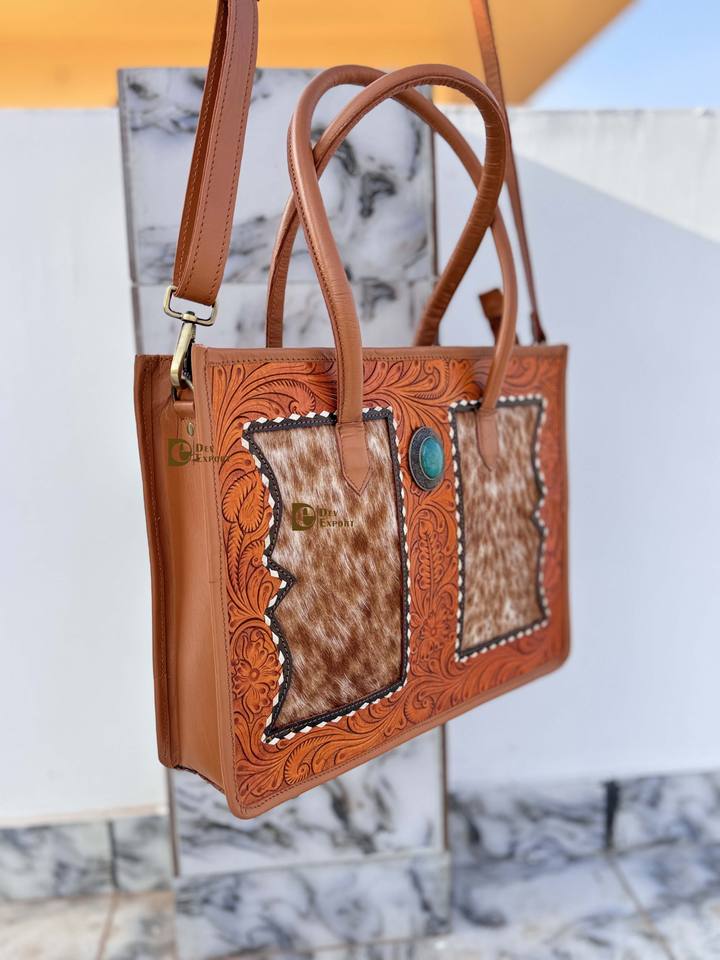 High Quality Carving Tooled Leather Big Size Tote Bag Cowhide Fur Leather Gypsy Boho Vintage Handmade Cross body Shoulder Bag