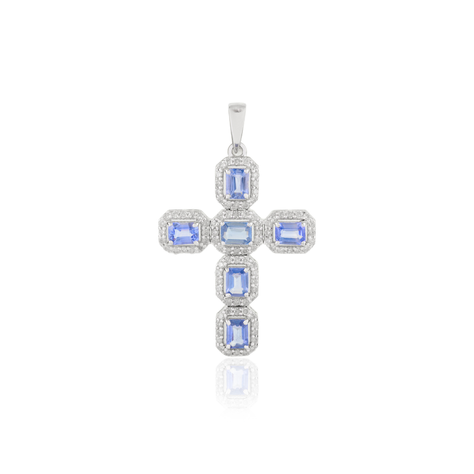 High Quality Classic Designer Genuine Blue Sapphire & Diamond Halo Set Cross Pendant Religious 14K Real White Gold Jewelry