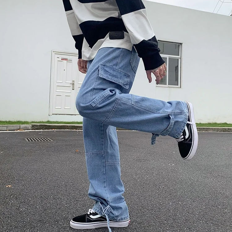 High Quality Classic Men's Wide Leg Woolen Jeans Elastic Waist Mid Rise Flat Breathable Polyester/Cotton New Design High Street
